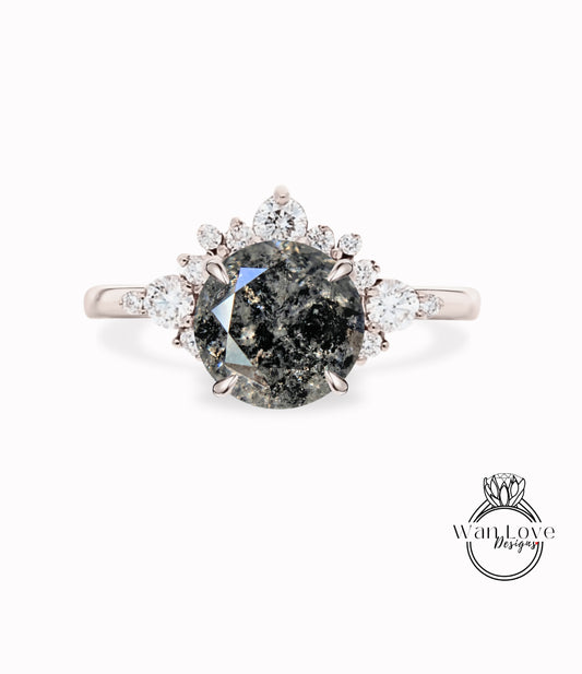 Salt & Pepper Diamond Cluster Half Halo engagement ring Diamonds Unique cluster round cut White Rose Gold Ring woman Promise Anniversary Gift