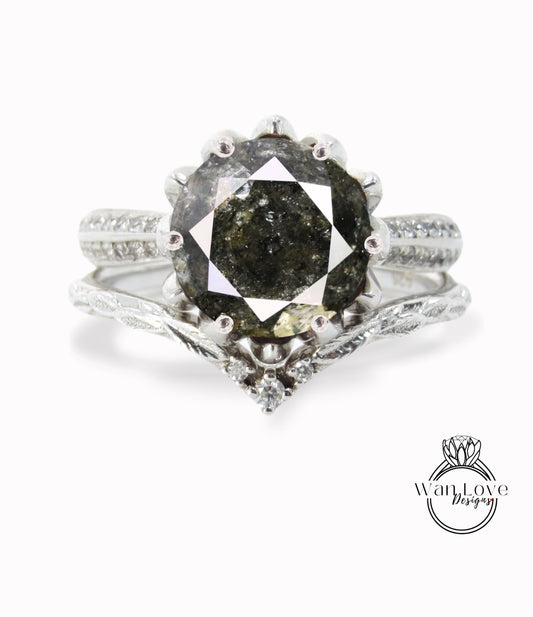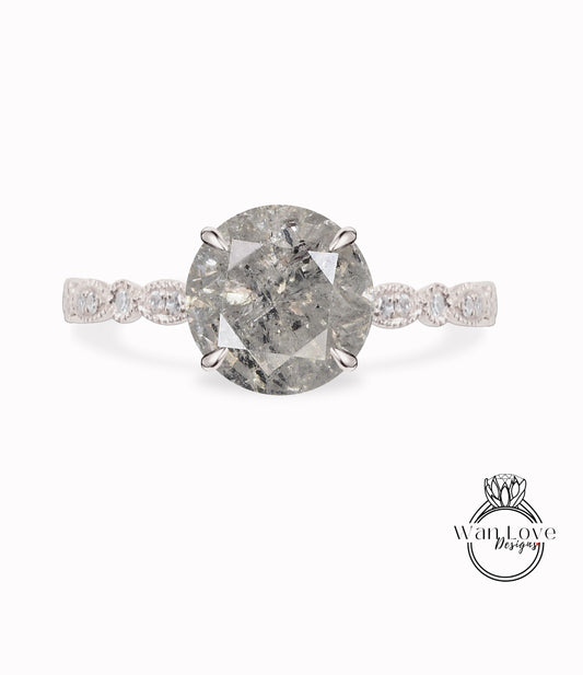 Salt & Pepper Round Diamond Scalloped Engagement Ring Vintage Milgrain Scalloped band Salt Pepper Diamond Bridal Ring Anniversary Gift