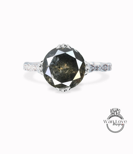 Salt & Pepper Diamond Milgrain Antique Scalloped Triple Fishtail prong Round Engagement Ring, Custom-Wedding-14kt 18kt Gold-Platinum