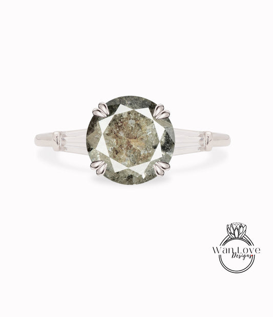 Salt & Pepper Diamond Round Tapered Baguette 3 gem Engagement Ring, Custom Moissanite lab diamond 14k 18k White Yellow Rose Gold Platinum Wedding bridal ring, Anniversary gift