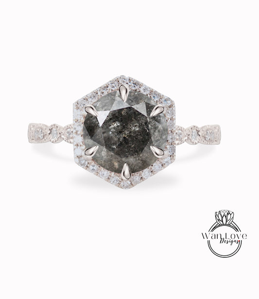 Salt & Pepper Diamond Hexagon Halo Scalloped Engagement Ring, Round cut Ring, Milgrain Vintage leaf wedding Bridal Ring, Anniversary Gift