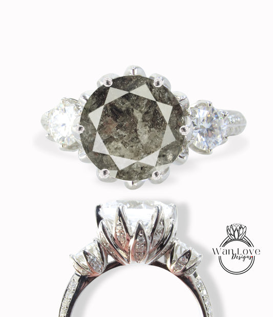 Salt & Pepper Diamond Lotus Flower 3 gemstone Engagement Ring, 14k 18k White Yellow Rose Gold-Platinum-Custom-Three gem stone Bridal Wedding Ring-Anniversary Gift
