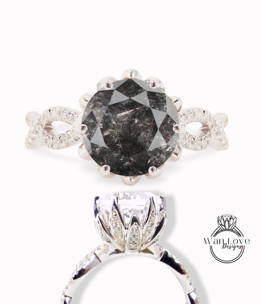 Salt & Pepper Diamond Lotus Flower Infinity Twisted Round Engagement Ring, 14kt 18kt Gold-Platinum-Custom-Wedding ring-Anniversary Gift