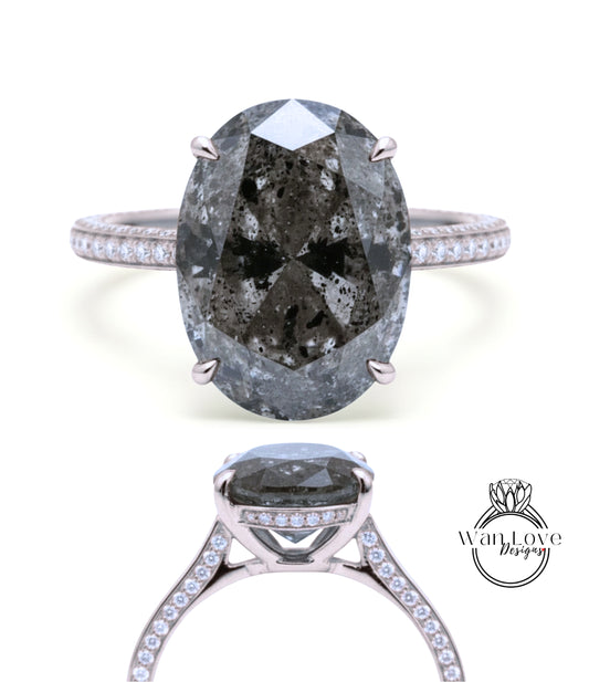 Salt & Pepper Diamond Oval side halo 3 sided Almost eternity shank band Engagement Ring 14k/18k Rose White Gold, Celebrity Elongated Oval Bridal wedding Ring, Anniversary Gift