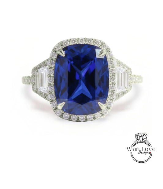 Blue Sapphire & Diamond Elongated Long Cushion Triple Halo Engagement Ring 3 Gem Stone Trapezoid Moissanite Diamond 14k 18k Rose White Yellow gold Platinum Anniversary Gift