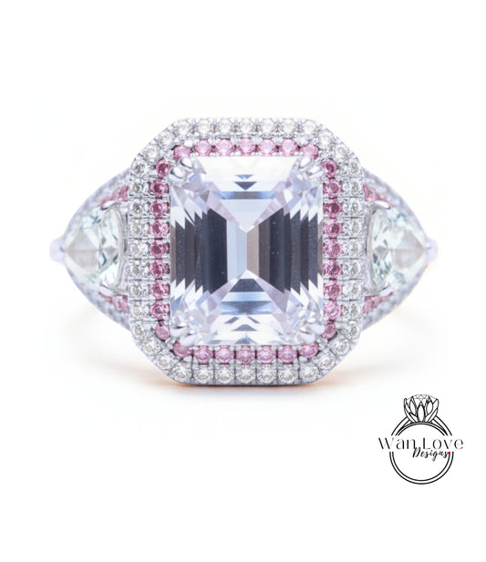 Light Pink Sapphire & Diamond 2 Double Halo Emerald Trillion Engagement Ring-14k 18k Gold, Platinum, Wedding bridal jewelry Anniversary Gift