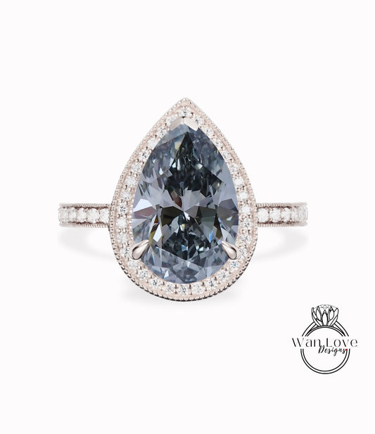 Art Deco Pear Engagement Ring, Antique Gray Moissanite engagement ring, diamond milgrain halo ring, vintage halo Ring, Unique Halo Ring