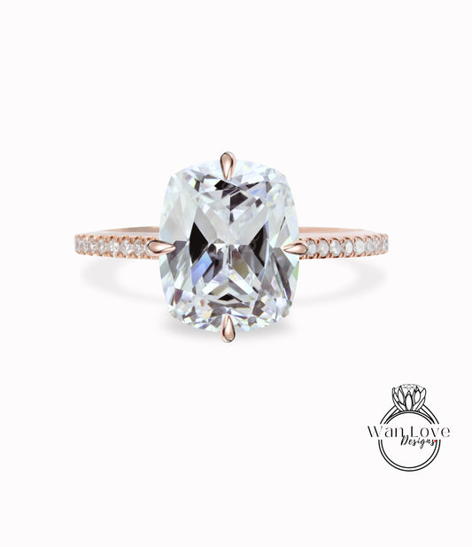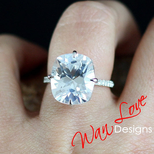 White Sapphire & Diamond Elongated Cushion NSEW prongs Engagement Ring Celebrity style Custom Bridal Wedding ring, Anniversary Gift
