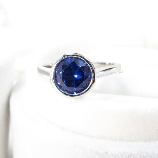 Blue Sapphire Round Bezel Engagement Ring, 14K 18k Gold Platinum Bridal Wedding jewelry, Plain Solitaire Bezel Setting, Anniversary Gift