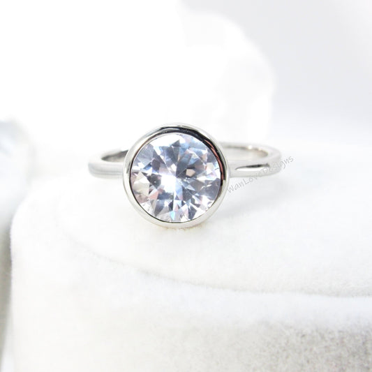 White Sapphire Round Bezel Engagement Ring, 14K 18k Gold Platinum Bridal Wedding jewelry, Plain Solitaire Bezel Setting, Anniversary Gift