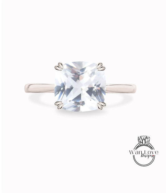WanLoveDesigns White Sapphire Wedding Ring, Cushion Solitaire Engagement Ring in 14k Rose/White/Yellow Gold/Platinum, Custom Bridal Ring