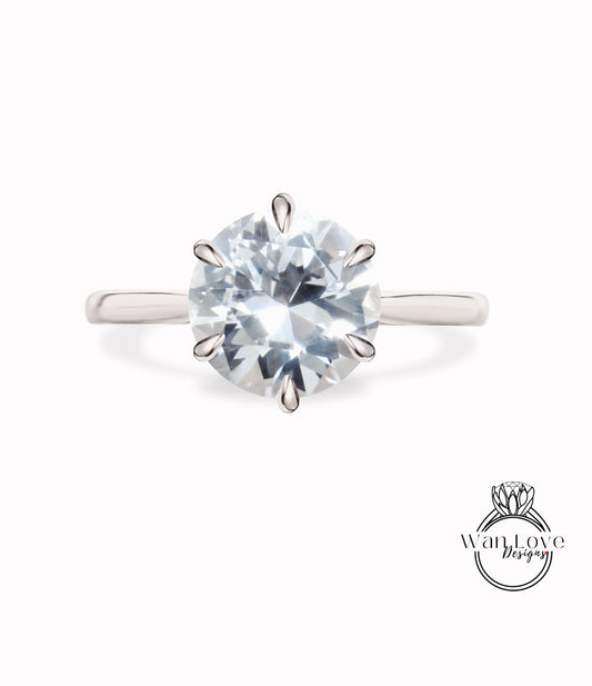 White Sapphire 6 Prong Solitaire Engagement Ring Round Cathedral 14k 18k White Yellow Rose Gold-Platinum-Custom-Wedding-Anniversary