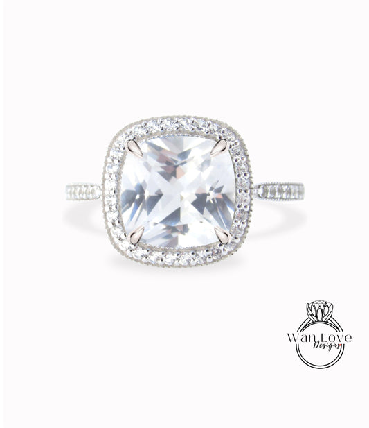 White Sapphire & Diamond Antique Cushion Halo Filigree Engagement Ring, 14k 18k White Yellow Rose Gold-Platinum-Custom-Wedding-Promise-Round