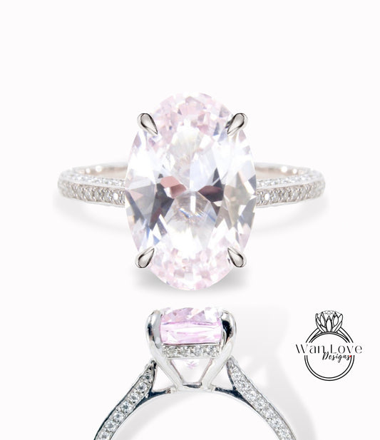 Light Pink Sapphire & Diamond Oval side halo 3 sided Almost eternity shank band Engagement Ring 14k/18k Rose White Gold, Celebrity Elongated Oval Bridal wedding Ring, Anniversary Gift