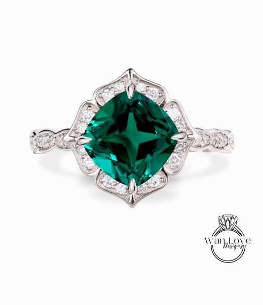 Emerald & Diamond Scalloped Floral Cushion Halo Leaf Antique Engagement Ring, WITH or WITHOUT Milgrain, 14k 18k Gold, Platinum Anniversary Gift