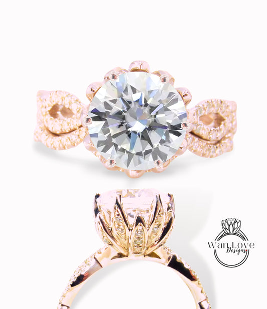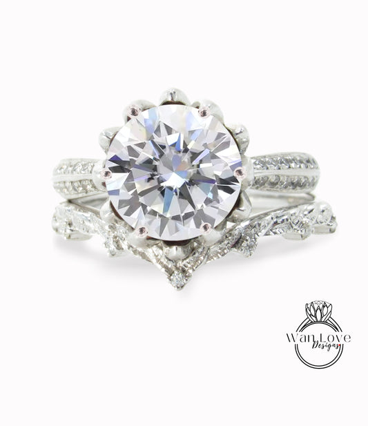 Moissanite & Diamond Lotus Flower Infinity Twist Shank Engagement Ring Set, Nesting Wedding Band, 14k 18k gold-Platinum-Custom, Gift