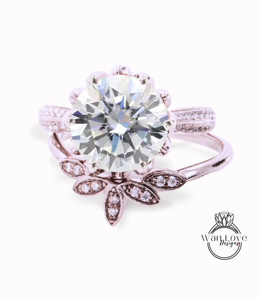 Round Diamond engagement ring set vintage Rose gold Lotus Flower engagement ring woman Certified Diamond bridal wedding set Unique Bridal Anniversary set