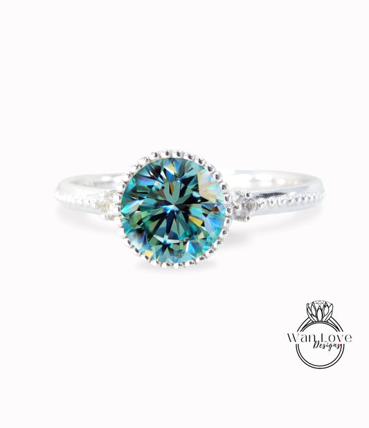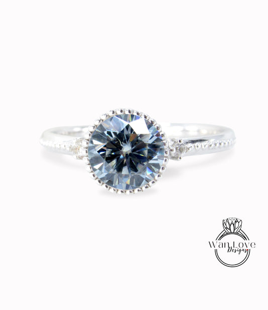 Milgrain Bezel Ring Blue Moissanite & Diamond Round cut Engagement Ring Art Deco round bezel Ring wedding bridal promise ring anniversary