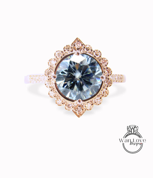 Geometric Halo Grey Moissanite Diamonds Engagement Ring Round Engagement Ring Vintage Milgrain ring antique halo moissanite bridal ring gift