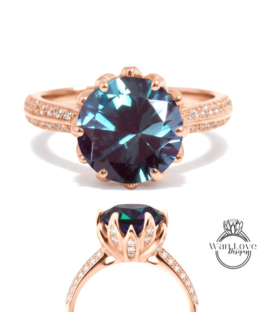 Anello di fidanzamento con fiore di loto con alessandrite e diamante, rotondo, personalizzato, oro rosa giallo bianco 14k 18k, platino, matrimonio, regalo di anniversario