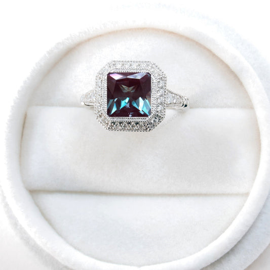 Anello di fidanzamento Halo con Alexandrite e Diamond Princess, gambo liscio, personalizzato, oro 14kt 18kt, platino, regalo di anniversario, WanLoveDesigns