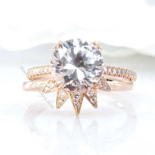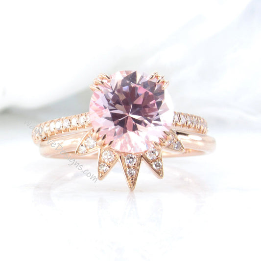 Set di anelli di fidanzamento con zaffiro pesca a taglio rotondo da 2 pezzi, set vintage in oro rosa, fascia a stella unica, anello di fidanzamento con grappolo di diamanti da donna, set regalo nuziale