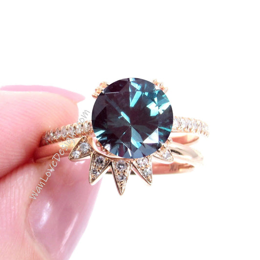Set di 2 anelli di fidanzamento con alessandrite a taglio rotondo, vintage in oro rosa, fascia unica con tiara a forma di stella, anello di fidanzamento con grappolo di diamanti da donna, set regalo nuziale
