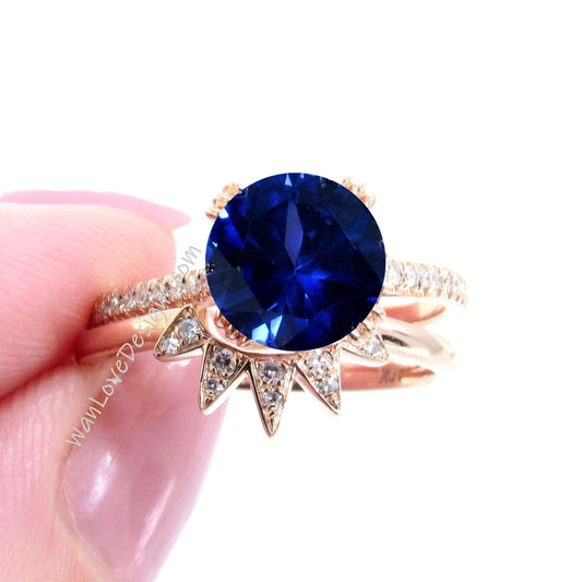 Set di anelli di fidanzamento con zaffiri blu a taglio rotondo da 2 pezzi, set vintage in oro rosa, fascia a stella unica, anello di fidanzamento con grappolo di diamanti da donna, set regalo nuziale