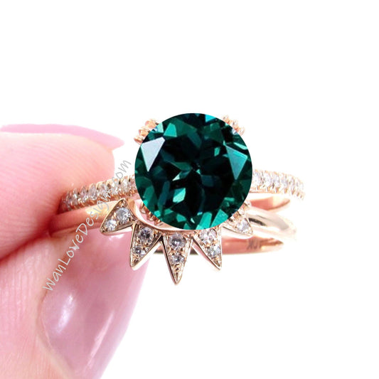 2 pezzi Anello di fidanzamento con smeraldi a taglio rotondo set vintage in oro rosa Unico taglio a stella Tiara Band Anello di fidanzamento con grappolo di diamanti da donna Set regalo da sposa