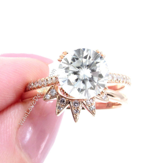 Anello di fidanzamento Moissanite con taglio rotondo da 2 pezzi, set vintage in oro rosa, fascia unica con tiara a forma di stella, anello di fidanzamento con grappolo di diamanti, set regalo da sposa