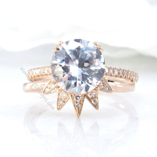 Set di anelli di fidanzamento con zaffiri bianchi a taglio rotondo da 2 pezzi, set vintage in oro rosa, fascia a stella unica, anello di fidanzamento con grappolo di diamanti da donna, set regalo nuziale