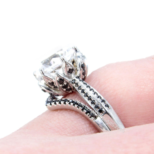 Anello di fidanzamento di loto con zaffiro bianco da 3 carati-anello di fidanzamento ispirato alla natura del fiore-anello di loto di spinello nero-set di anelli vintage-pronto per la spedizione