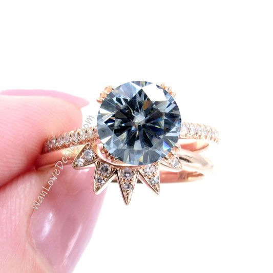 Anello di fidanzamento Moissanite grigio rotondo da 2 pezzi set vintage in oro rosa Fascia Tiara con stella unica Anello di fidanzamento con grappolo di diamanti da donna Set regalo da sposa