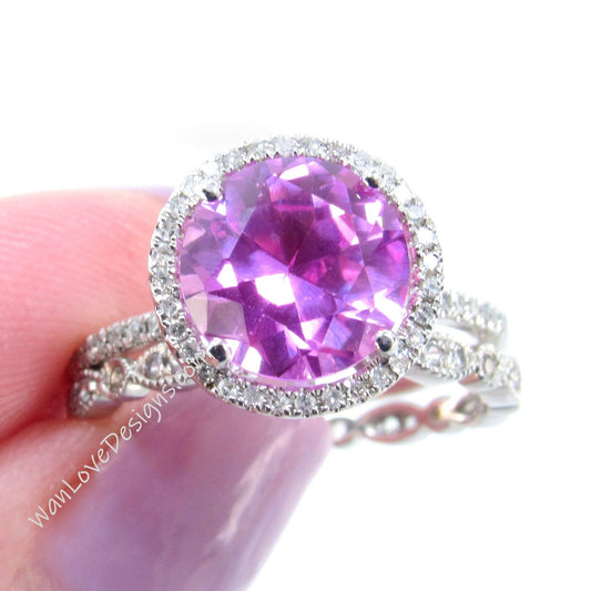 Anello di fidanzamento Halo con diamante zaffiro rosa da 3 ct Set Halo rotondo Full Eternity art deco Milgrain Leaf Wedding Band set gioielli da sposa vintage