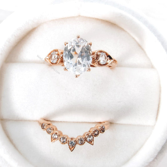 Set di anelli di fidanzamento ovali Milgrain con zaffiro bianco da 3 ct, con corona sagomata, curva, con fede nuziale, regalo di anniversario rotondo, pronto per la spedizione