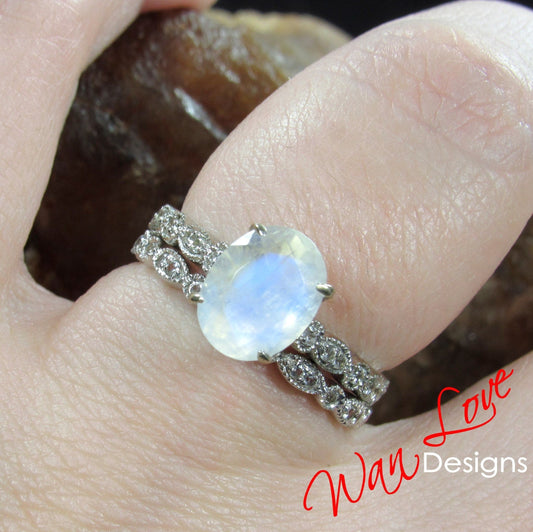 Anello di fidanzamento ovale Milgrain in pietra di luna vintage da 3 ct Set antico Eye Leaf Milgrain Full Eternity Wedding Band set anello di promessa nuziale per lei