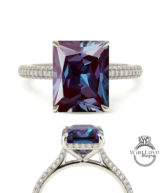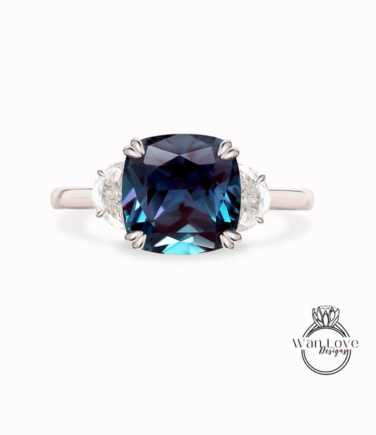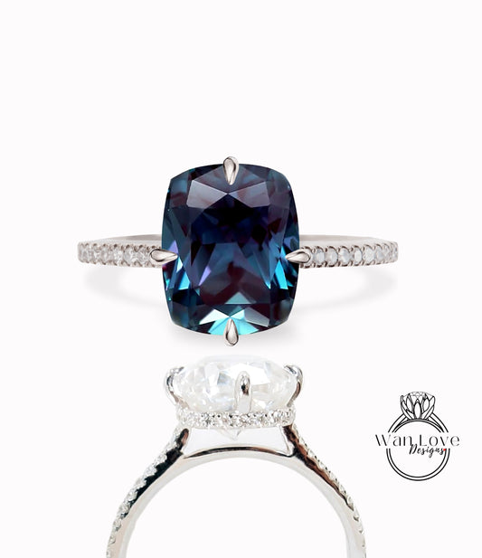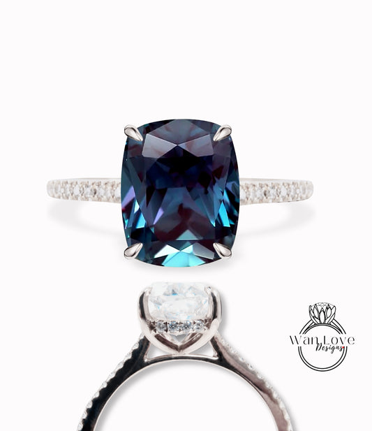 Anello di fidanzamento con aureola laterale con cuscino allungato con alessandrite e diamanti, matrimonio in platino in oro rosa 14kt 18kt, WanLoveDesigns