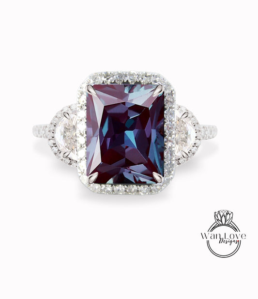 Anello di fidanzamento con smeraldo East West Halo di diamanti e alessandrite, 14k 18k bianco giallo oro rosa, platino, personalizzato, matrimonio, anniversario