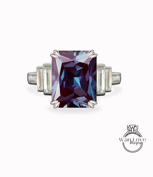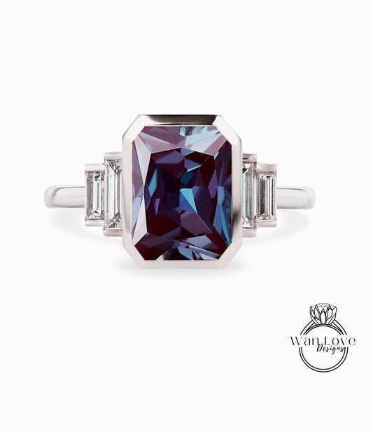 Anello di fidanzamento con alessandrite e diamante, anello con alone laterale, anello con taglio smeraldo, anello con gambo a fascia semplice, anello personalizzato, matrimonio o anniversario