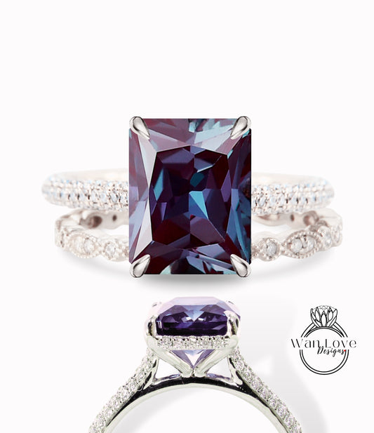 Set di anelli di fidanzamento con taglio smeraldo e diamanti con alessandrite, fede nuziale per l'eternità completa personalizzata-14k 18k bianco giallo oro rosa-platino