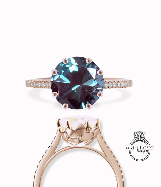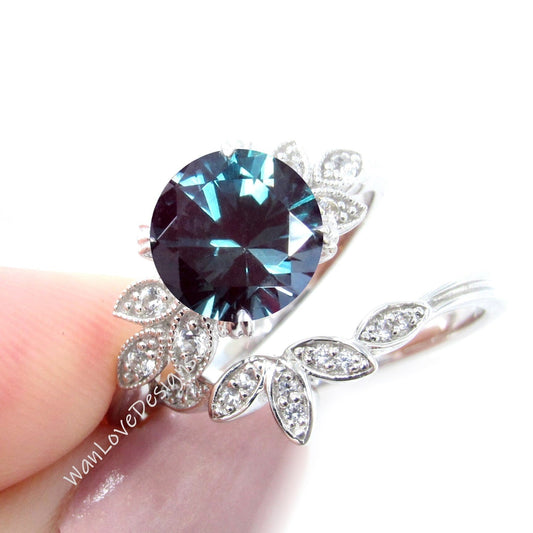 Anello di fidanzamento con foglia Milgrain con alessandrite e diamante, taglio rotondo, 14k 18k bianco giallo oro rosa-platino-matrimonio personalizzato, WanLoveDesigns