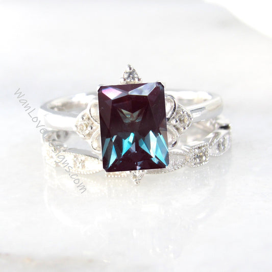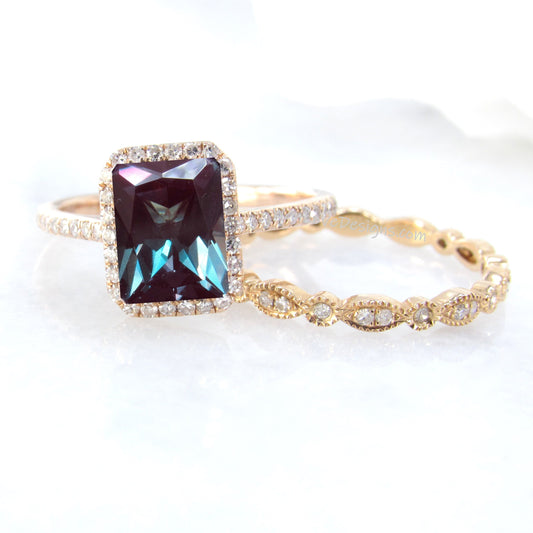 Set di anelli di fidanzamento radianti con alessandrite e diamanti, set di anelli di fidanzamento con foglie Milgrain, per l'eternità, personalizzati per celebrità