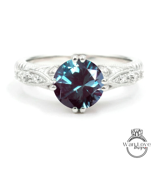 Anello di fidanzamento rotondo con incisione antica con alessandrite e diamante, personalizzato-14k 18k bianco giallo oro rosa-platino-anniversario di matrimonio