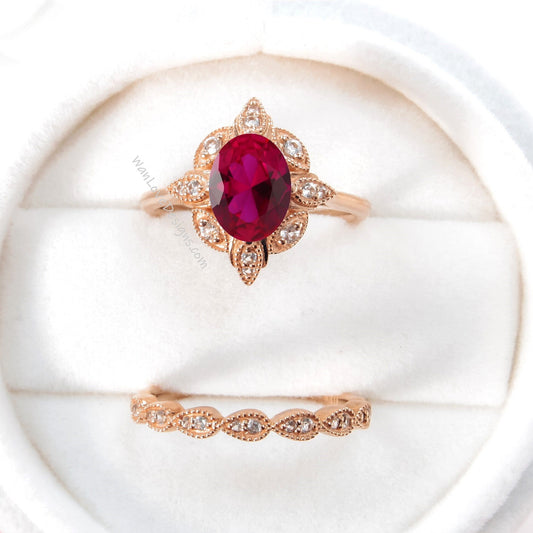 Set di anelli di fidanzamento con rubino ovale Anello di fidanzamento vintage Halo in oro rosa Pera Mezza eternità Anello con diamanti Regalo per l'anniversario della sposa