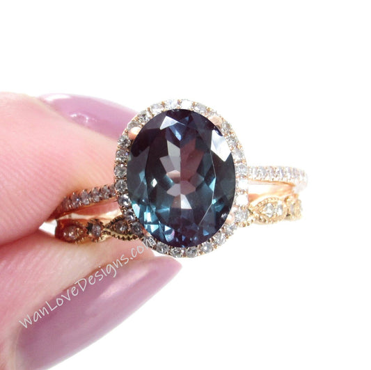 Anello di fidanzamento con diamante Alessandrite di forma ovale incastonato in oro rosa Halo Anello di fidanzamento unico da donna vintage Fede nuziale a foglia mezza eternità