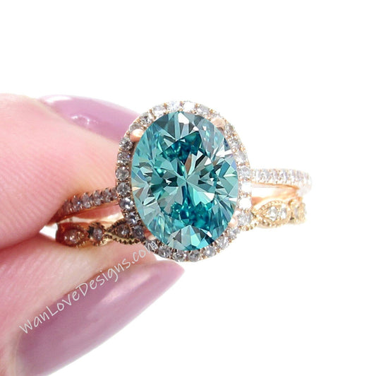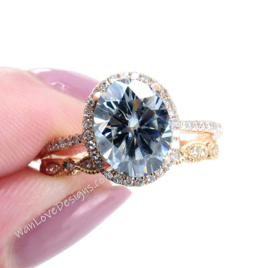 Anello di fidanzamento con diamante Moissanite blu a forma ovale con set in oro rosa Halo Anello di fidanzamento unico da donna vintage Fede nuziale a foglia mezza eternità