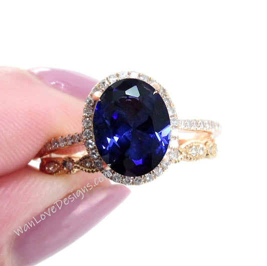 Anello di fidanzamento con diamante e zaffiro blu di forma ovale con set in oro rosa Halo Anello di fidanzamento unico da donna vintage Fede nuziale a foglia Half Eternity