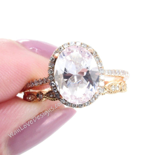 Anello di fidanzamento con diamante rosa chiaro e zaffiro di forma ovale con set in oro rosa Halo Anello unico da donna vintage Fede nuziale a foglia Half Eternity