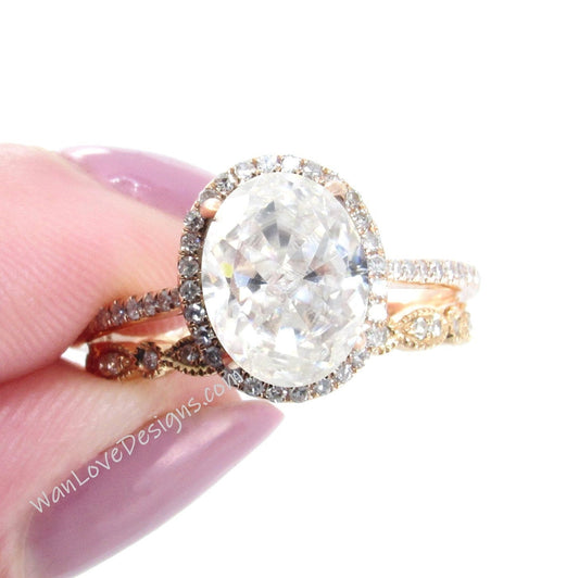 Anello di fidanzamento con diamante Moissanite di forma ovale con set in oro rosa Halo Anello di fidanzamento unico da donna vintage Fede nuziale a foglia Half Eternity