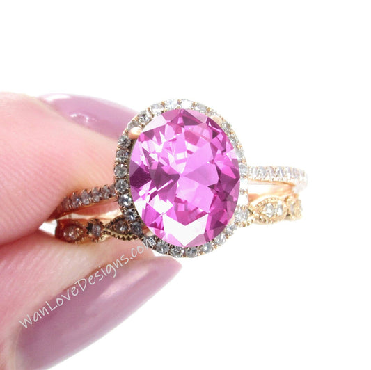 Anello di fidanzamento con diamante zaffiro rosa di forma ovale in oro rosa Halo Anello di fidanzamento unico da donna vintage Fede nuziale a foglia Half Eternity